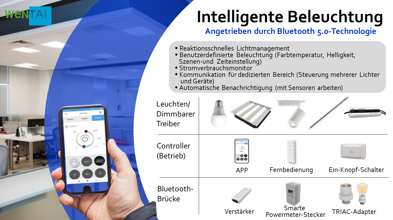 Der Controller hat eine Größe von L110 x B38 x T12 mm und eine Reichweite von bis zu 30 Metern im freien Raum. Es ist mit Magneten zur einfachen Befestigung an einer Montagehalterung ausgestattet, die eine optionale Lösung ist. Zwei Farben des Controllers sind in Schwarz oder Weiß erhältlich. Wentai könnte Ihnen einen hochwertigen Bluetooth-Controller unter Ihrem Markennamen anbieten und Ihnen helfen, sich mit Ihrem eigenen Cloud-Server zu verbinden. • Fernabstände bis zu 30 m • Batteriebetrieben CR2032 • Wandmontage mit Plattensockel möglich • Magnet auf der Rückseite, der einfach auf Metalloberflächen geklebt werden kann • Größe (H x B x T): 110 x 38 x 12 mm • 1 Jahr Garantie • Erforderliches System: Android 5.0 oder höher