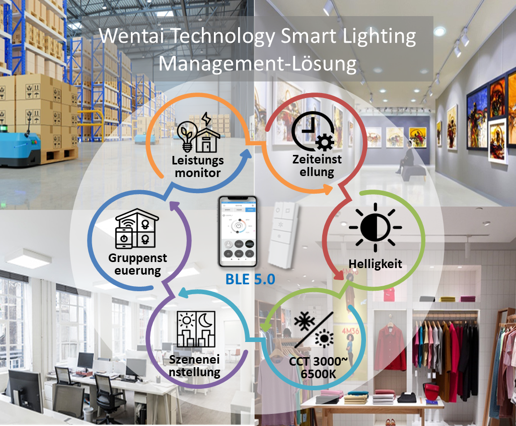 • Drahtlose Steuerung der Beleuchtung nutzt Bluetooth 5.0-Technologie • Verfolgung des Stromverbrauchs und Umwandlung von Daten in Energiesparanalysen. • Programmieren von Lichtbedingungen –Ein-/Ausschalten aktivieren, Beleuchtungsintensität und Farbtemperatur anpassen, Kontrolle über bestimmte Lichter oder ganze Cluster erlangen, Lichter nach einem voreingestellten Zeitplan und einer Szene über die mobile APP laufen lassen. • Sensorverbindung für intelligentere Automatisierung und bessere Effizienz ,wie z. B. Bewegungssensor, kann die Energieeinsparung maximieren und die Verfügbarkeit von Licht optimieren, wann und wo es benötigt wird.